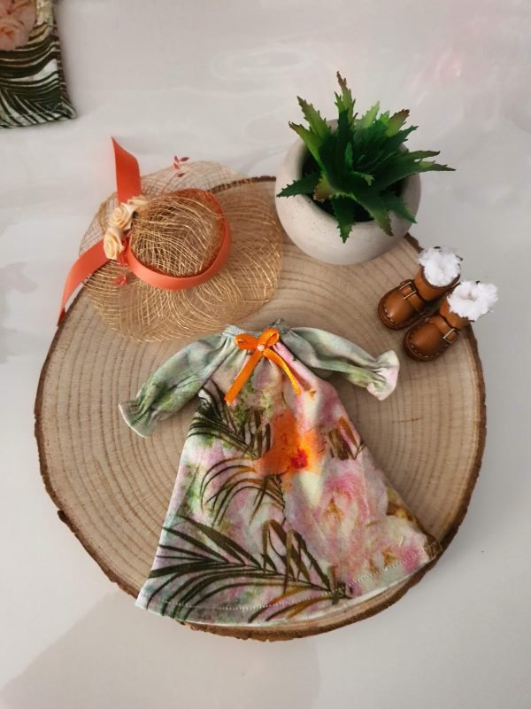 Vestido elaborado a mano con detalle degradado en rosa y naranja, en tela %100 algodón, con un lazo anaranjado y un sutil recogido en mangas super fresh y divertido serás la envidia de tus amigas Blythe! – No incluye accesorios.