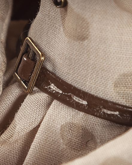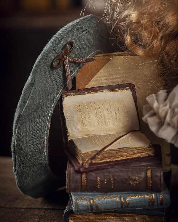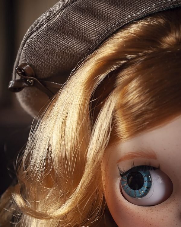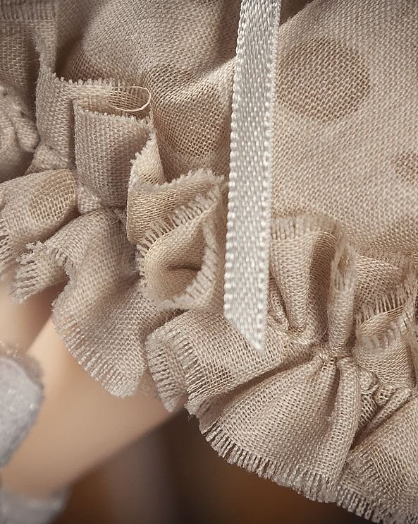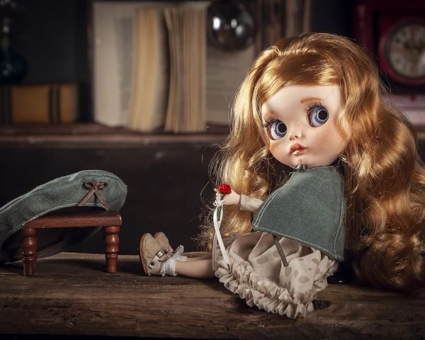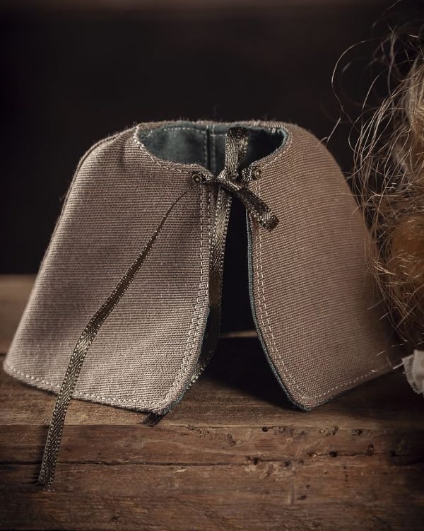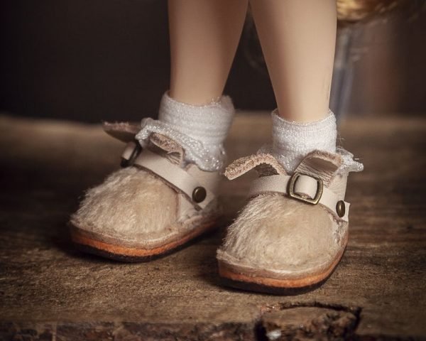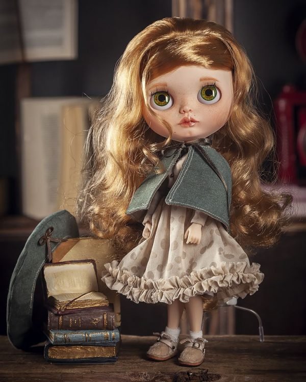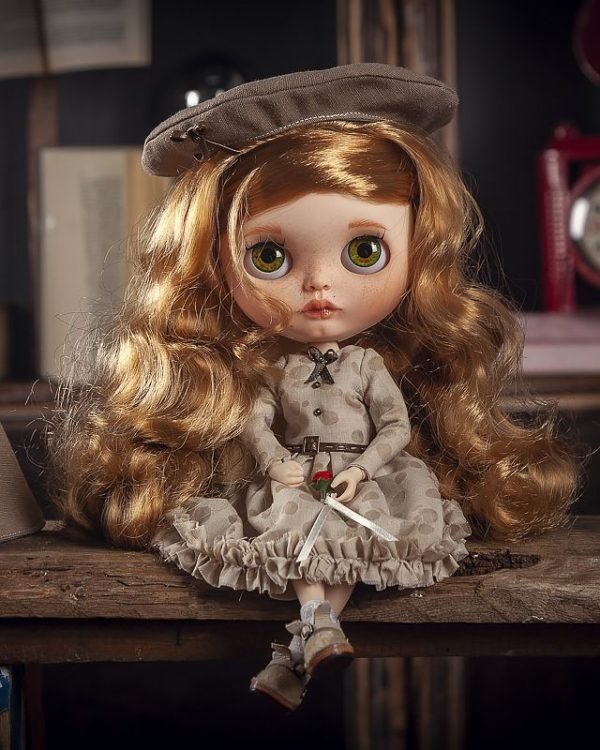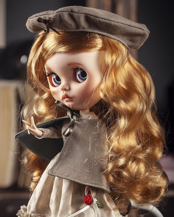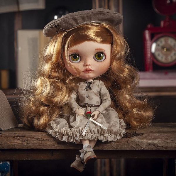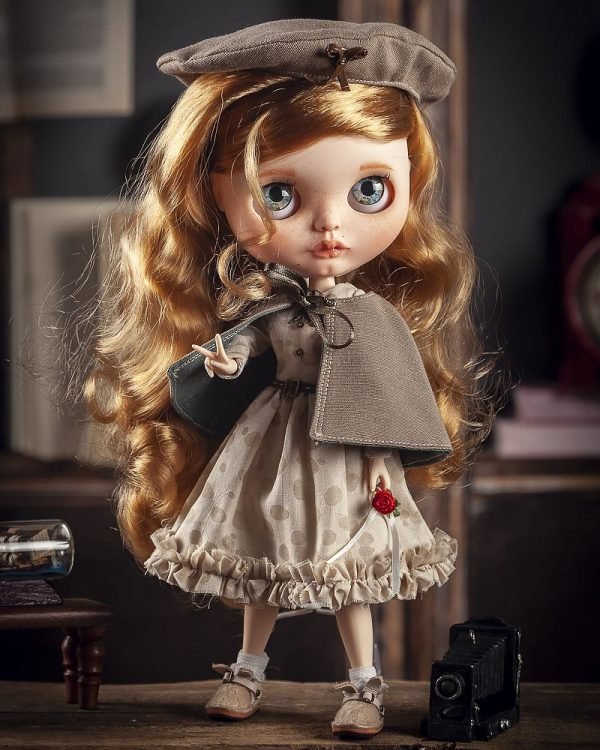 Boina reversible en color verde desgastado y marrón estilo vintage. Vestido vintage en color beige con botones en la parte delantera y una correa de cuero sujeto al vestido. Lleva una capa reversible en dos colores marrón y verde desgastado. Todo el vestuario está cosido con sumo cuidado en los detalles ademas lleva unos zapatitos de piel estilo conejito a juego del vestuario en color beige de cuero real. El cabello es un rubio muy bello con rizos. Asegúrate de sostener la parte posterior de su cabeza con una mano al tirar de sus cuerdas para cambiar sus ojos. Con la otra mano con el fin de minimizar la tensión.